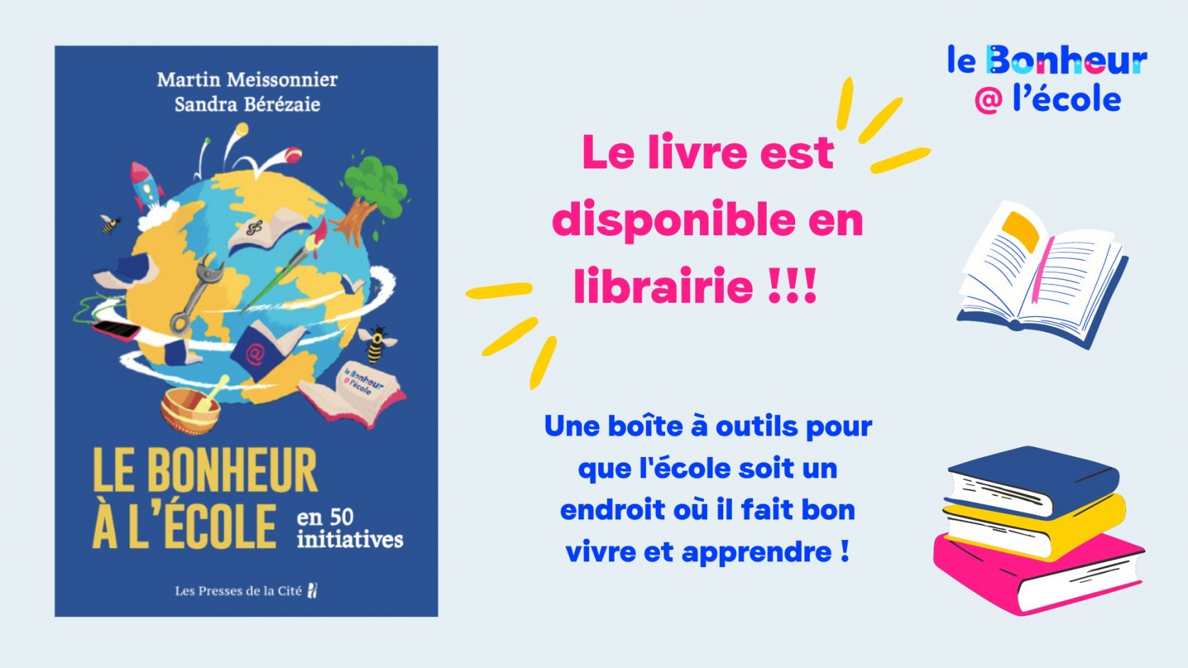 Ça y est ! Le livre « Le Bonheur à l’École en 50 initiatives » est disponible aujourd’hui en librairie !